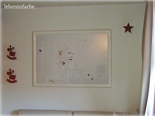 so entwarf ich also ein passendes bild und bestellte es mir vor einigen wochen als poster, jedoch nicht bei dem gleichen wie sari. die größe ist der wahnsinn, das poster relativ empfindlich, aber perfekt geschützt in dem rahmen. und ich finde es großartig. okay, ich bin auch nicht objektiv, mein bild, mein kind, klar ist das großartig. aber so ganz in echt, ohne spiegelung und so wirkt das ganze auch viel edler und NOCH größer. auf dem foto sieht das erschreckend klein aus.